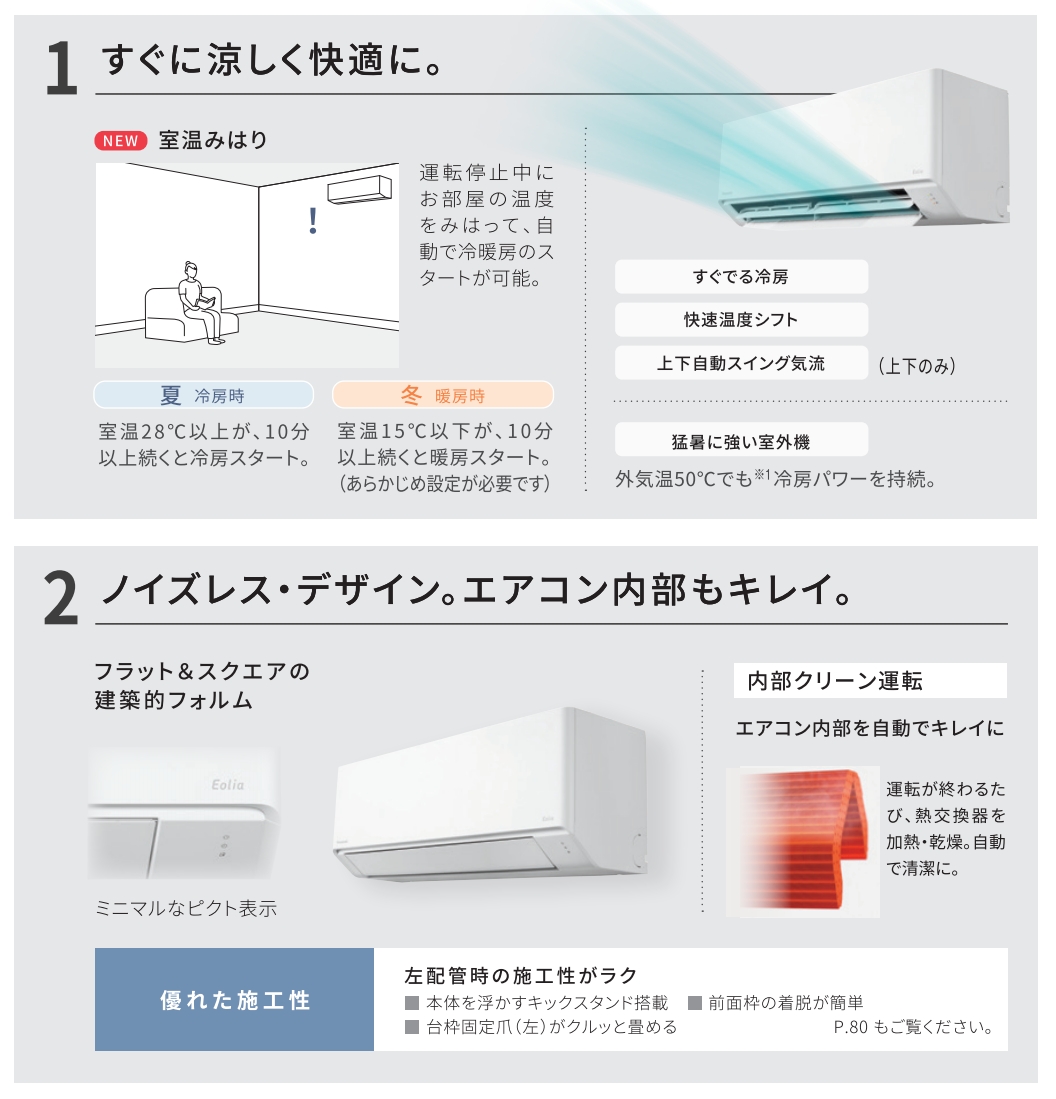《商品ご案内》 ★コンパクトな室内機:全クラス和室の半間幅に収まります。 ★コンパクトな室外機:ベランダもスッキリ!(3.6kWクラス以下) ★高機能ではありませんが、基本機能を備えたスタンダードモデルです。 ★リビングや茶の間はもちろん客間、子供部屋、書斎に!